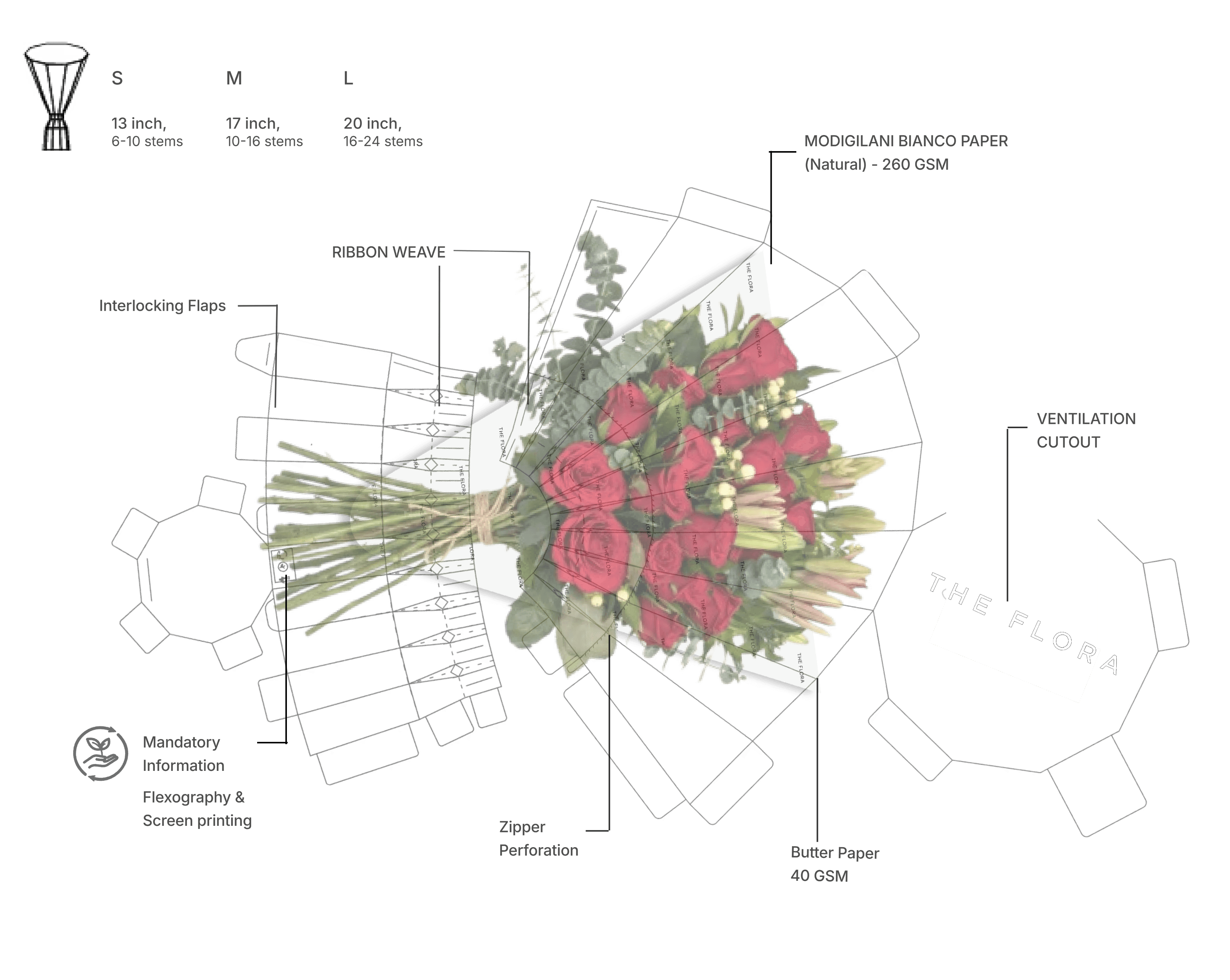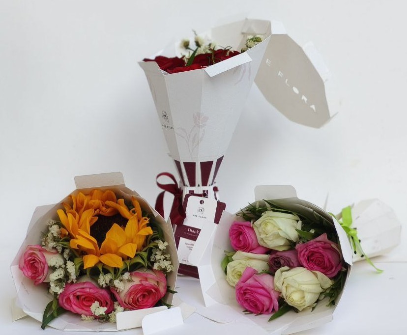 A Sustainable Flower bouquet packaging for 'The Flora' brand designed to preserve freshness while elevating the gifting experience.
