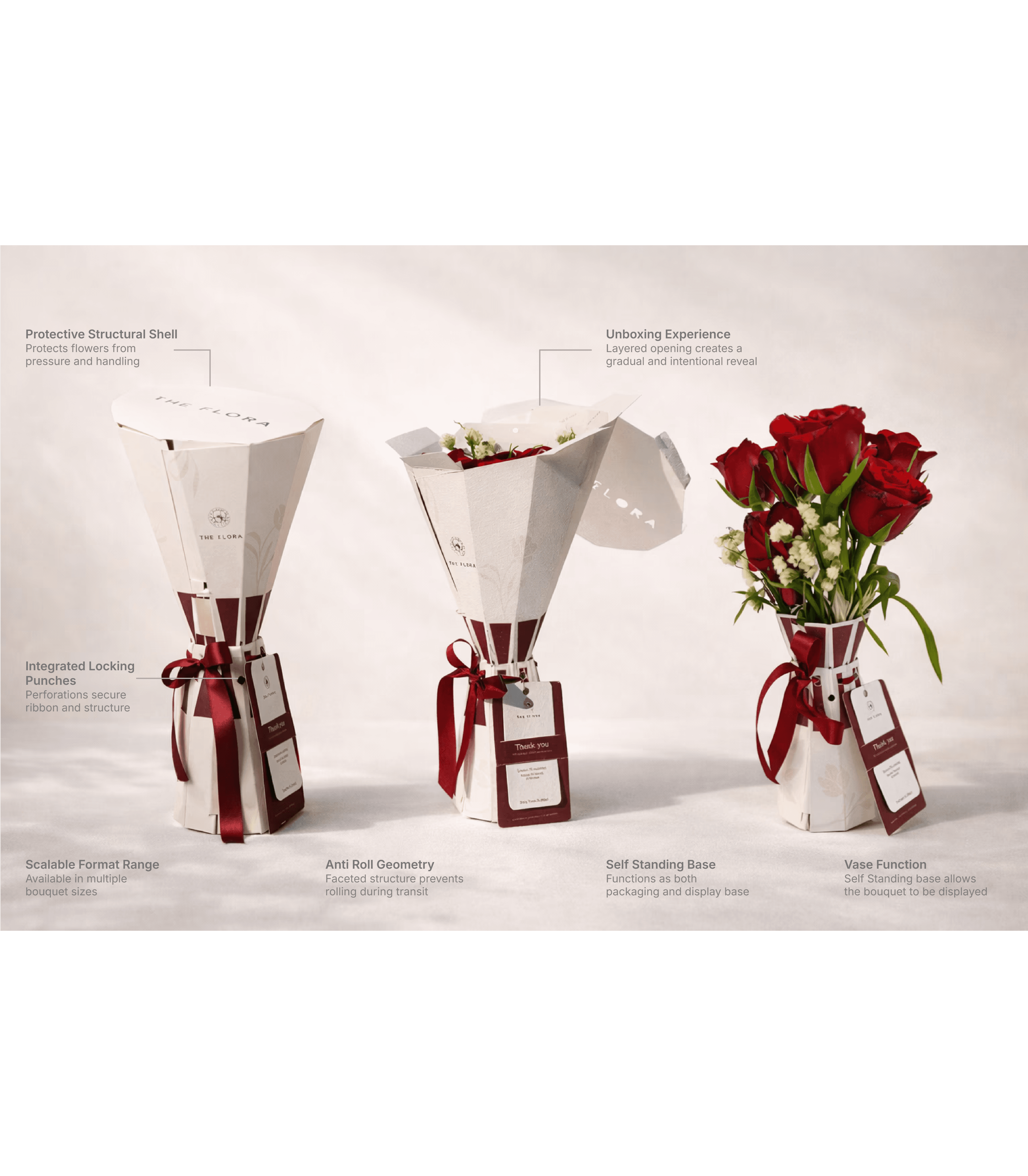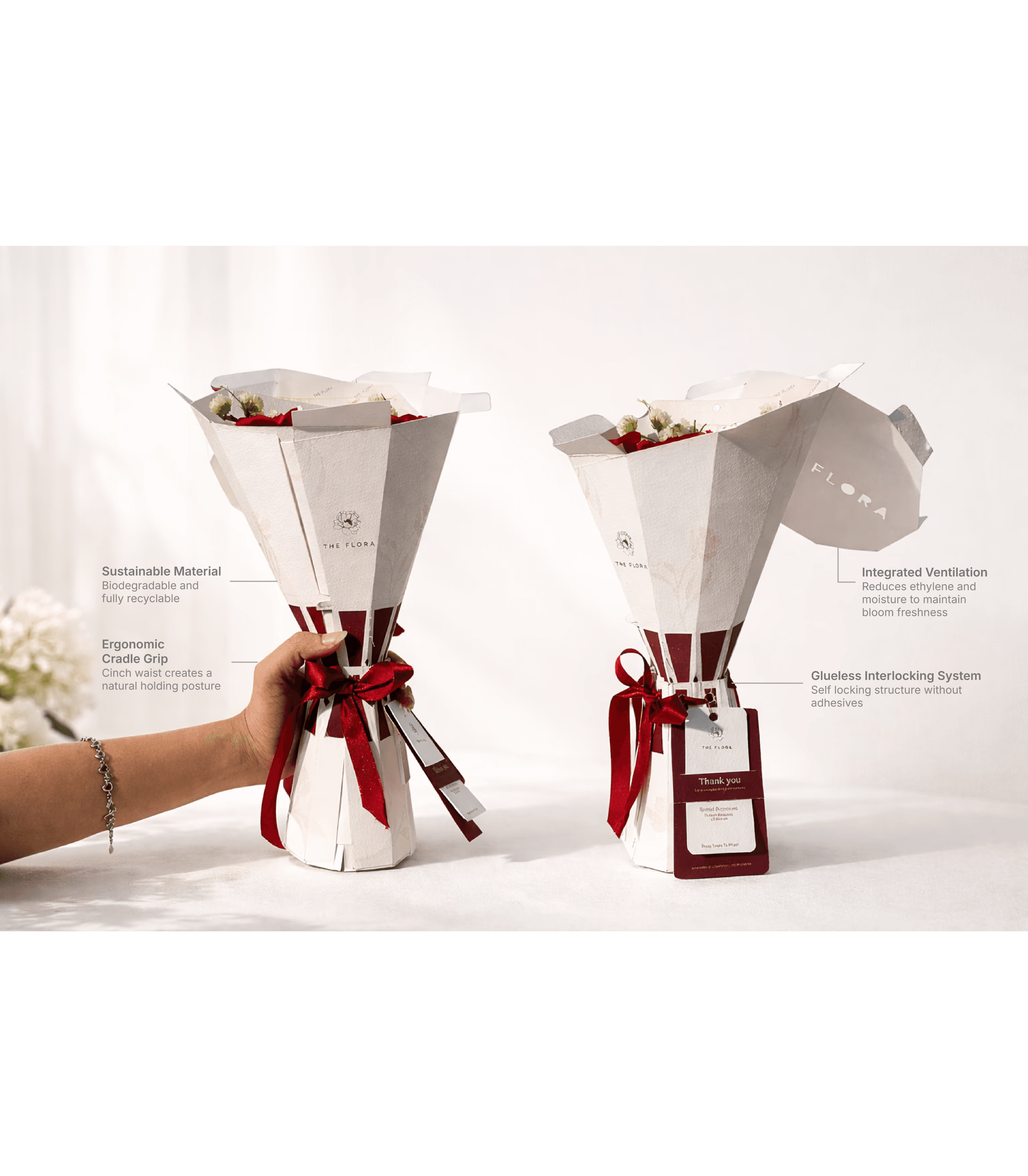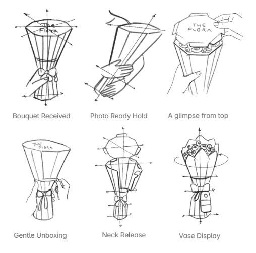 To design a sustainable and protective bouquet packaging system that preserves floral freshness, enhances ergonomic handling, and introduces a structured unboxing reveal extending both