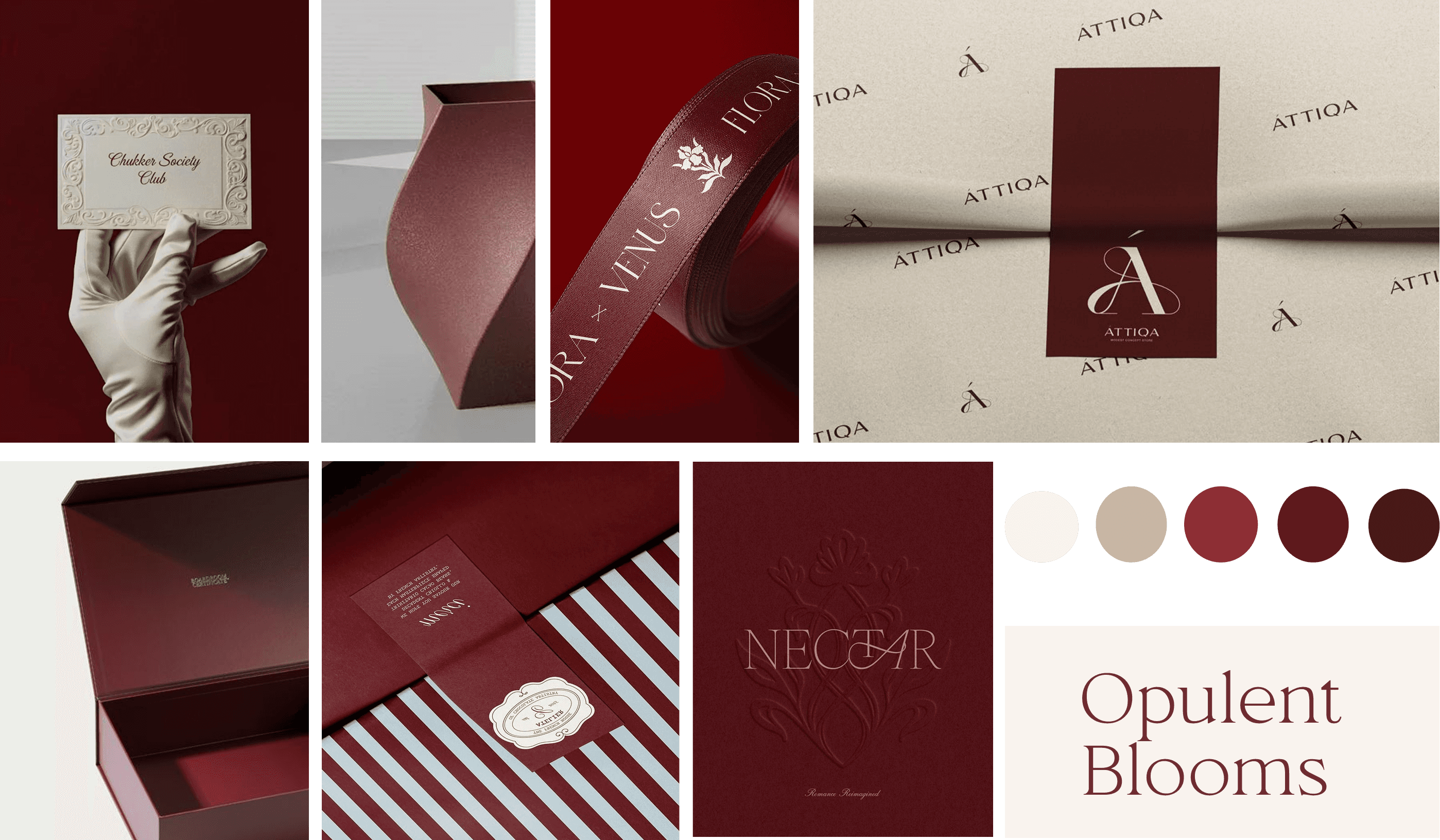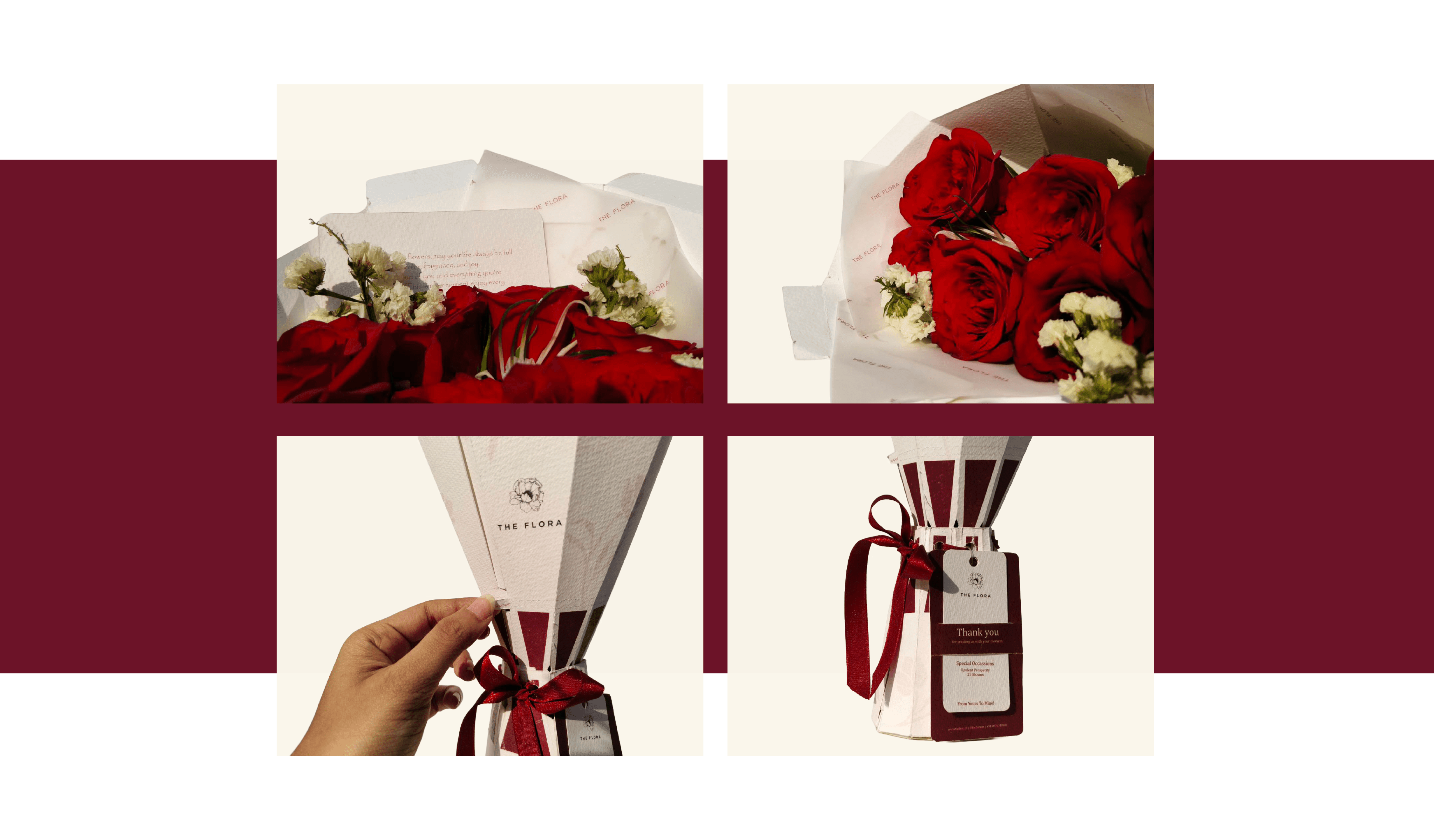 Opulent Blooms frames bouquet packaging for special occasions through deep red accents, rich textures, and structured forms that express quiet luxury.